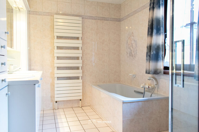 Het gelijkvloers omvat oa. een inkomhal, een toilet, een mooie living in L-vorm, een ingebouwde keuken, een berging, een badkamer met ligbad en douche, een bureel, een tweede ingerichte keuken, een slaapkamer en een tweede badkamer met ligbad.