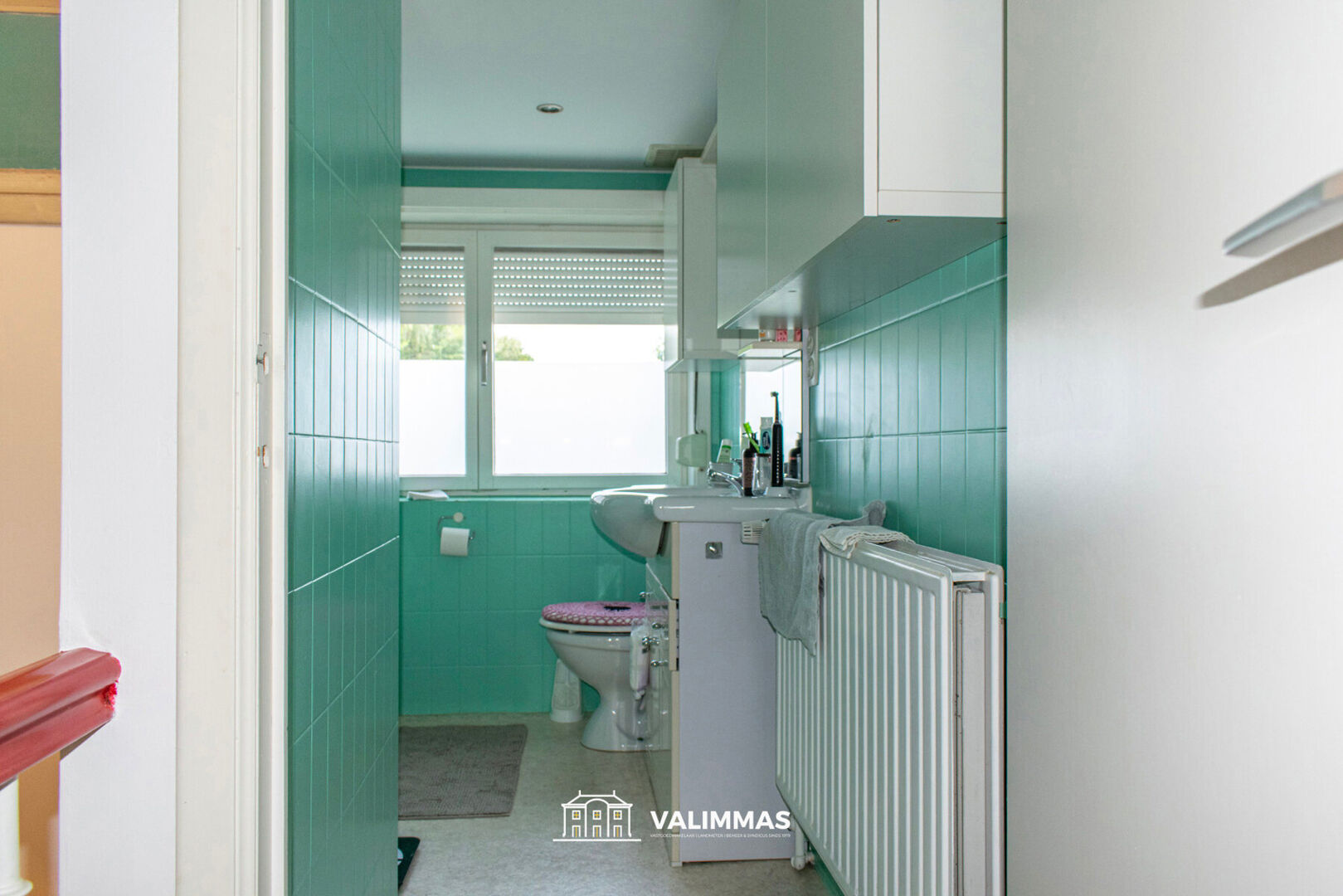 De eerste verdieping herbergt een overloop, een toilet, een ruime living met schuifraam naar het overdekte terras achteraan (± 29m²), een keuken en een balkon vooraan.