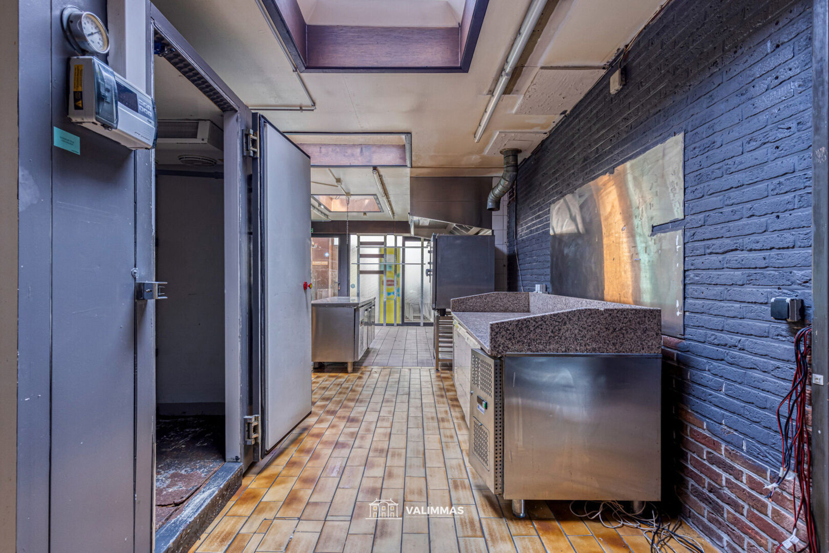 Het gelijkvloers omvat een ruime verbruikszaal (± 90m²) met toog, een sanitaire ruimte met toiletten, en een grote keuken met koelcel.