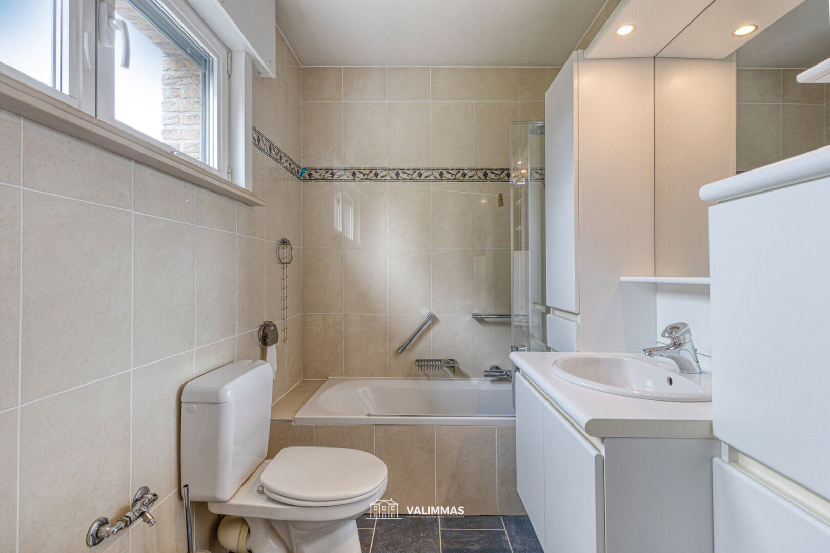 Het gelijkvloers bestaat uit een inkomhal met trap en lift, een ruime garage met was- en stookplaats, een living met open ingerichte keuken en mooi zicht op de tuin, een berging, een bureel of slaapkamer, en een badkamer.