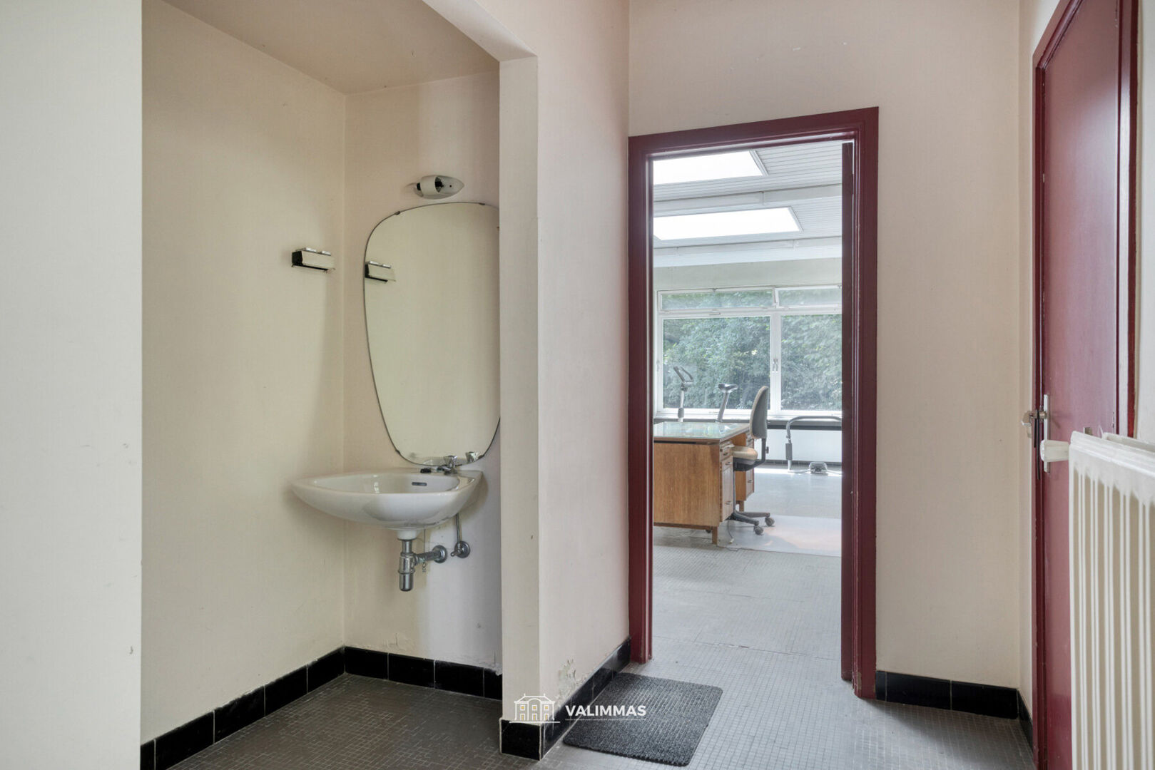 Deze zeer ruime en solide villa omvat op het gelijkvloers een centrale inkomhal, een toilet, een berging, een bureel, een keuken, een salon en een living met imposante schouw/open haard en uitzicht op het zonneterras en de beboste tuin. De praktijkruimte (voormalige dokterspraktijk) beschikt ook over een aparte toegang met hal en toilet, een wachtkamer of bureel, en de praktijkruimte of bureel met zicht op de tuin. Er is tevens een ruime garage beschikbaar.